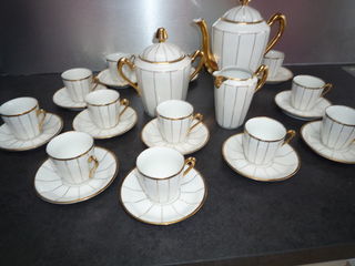 Service à café des années 30. Comprenant: Une cafetière avec couvercle - Un sucrier avec couvercle - Un pot à lait. 12 tasses - 12 sous / tasses. Blanc avec lignes d'or. Jamais