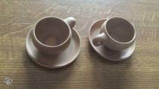 Lot de 2 tasses à café expresso blanches avec anses + sous tasses Jamais servi Toute petite ébréchure sur une des 2 tasses ( voir photos)