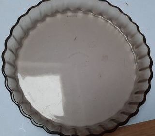 un petit plat à tarte des années 70 en verre fumé de la marque Arcopal Henkel. diamètre 19 cm hauteur : 3 cm 10 euros