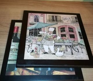 DESSOUS DE PLATS en bois, marché / bouteilles vin / sous-plats FAIRE OFFRE / 18 x 18 cm / peuvent être vendus séparément / envoi possible Info : annonce sur site = artic