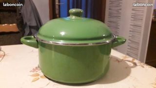 Vends 1 ancienne marmite émaillée de couleur verte et de marque MENASTYL. Diamètre de 26 cm et hauteur de 14 cm. État impeccable, je la vends 20 euros. Contact par mail ou par télé
