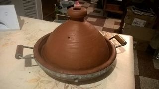 Vends 1 tajine en terre cuite sertie d' un cerclage avec fond en métal pour permettre les cuissons sur plaques électriques et au gaz. Fabrication artisanale, diamètre de 30 cm. En