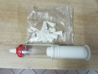 Bonjour, seringue à pâtisserie 100ml, état neuf, fourni avec 12 embouts pour motifs différents. Prix 5 euros, contact mail, paiement sécurisé, envoi mondial relay, la poste, ou à p