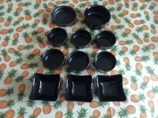Bonjour, lot de ramequins noir. 1 ramequin Fleury Michon diamètre 130mm, hauteur 45mm, 1 ramequin diamètre 120mm, hauteur 25mm. 6 ramequins diamètre 90mm, hauteur 35mm. 3 ramequins