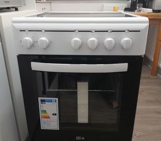 Cuisinière électrique blanche en très bon état, équipée d'un four et d'un tableau de commande à boutons rotatifs. Dispose d'un étiquetage énergétique de classe A. 50*60 neuve