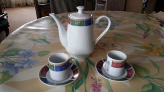 Service à café 6 tasses avec 6 soucoupes et une cafetière Porcelaine blanche avec un décor multicolore État neuf dans son emballage d'origine. A prendre sur place