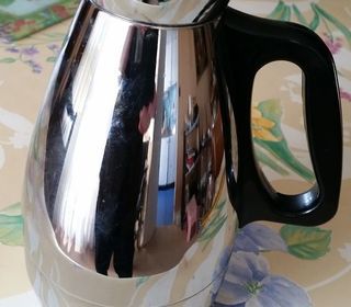 Carafe Thermos en acier inoxydable Anse noire ergonomique Bouchon noir à visse pour l'étanchéité Forme à bec verseur Dimensions : 25 cm de hauteur A prendre sur place