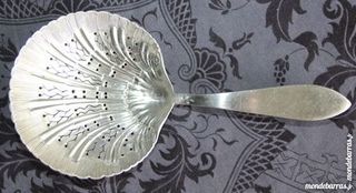Saupoudreuse coquillage Armand FRENAIS cuillère à fraises métal argenté XIX ème siècle , Napoléon III diamètre coquille 8 cm longueur totale 17 cm poids 77 grs très bel é