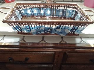 Bonjour, joli plateau en rotin décoré. Année 60, fait main. Longueur 35cm, largeur 20cm, hauteur 9cm, poids 170gr. Avec poignées, pour le petit déjeuner, le dîner, les invitations.