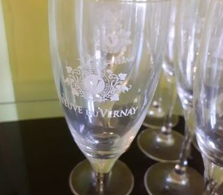 4 flûtes en verre transparent gravure "Veuve du Vernay", hauteur 19 cm.
