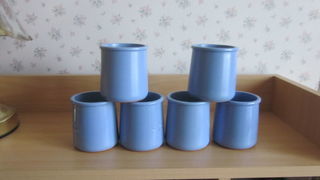 9 petits pots en grès de couleur bleue Hauteur ----- 7 ,5 cm diamètre -------------- 7 cm Idéal pour mettre des entremets, fromage blanc, compote ou à utiliser comme verrine Tr
