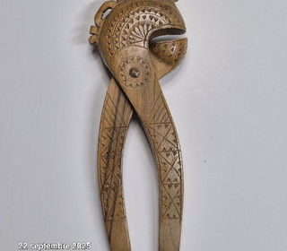 Ancien casse-noix, noisettes en bois, sculpté à la main, de style brutaliste / rustique. Très beaux motifs sur le corps du casse-noix. D'origine savoya