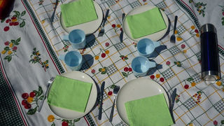 Sac isotherme / Glacière : En PVC Poignet Gris Vaisselles en plastique Pour 4 Personnes 4 assiettes, 4 goblets,( 4 couteaux, 4 fourchettes,) Bouteille isotherme neuve P
