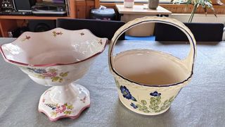 Vends 2 corbeilles à fruits en céramique dont une peinte à la main en très bon état diamètre 27 et 24cm