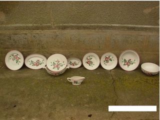 12 assiettes creuses 22 assiettes plates 1 plat oval 2 petits plats ovals 1 plat rond 1 plat rond creux 1 saucier 1 saladier 1 soupière