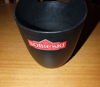 Seau à champagne publicitaire marque Sobieski. 24 cm de haut, 20 cm de diamètre en haut, 10 cm de diamètre à la base. Vendu à l'unité ou en groupe