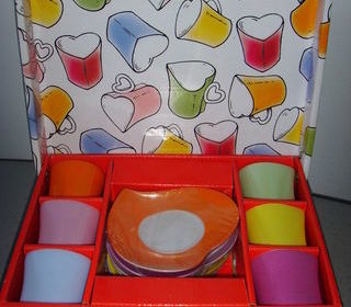 Coffret de 6 tasses à café de différentes couleurs + 6 sous-coupes assorties en forme de coeur Dimensions du coffret Longueur : 25 cm Largeur 20 cm Neuf