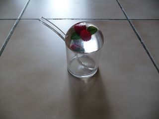 Joli pot à confiture en plexiglas avec couvercle en résine et inclusion de framboises avec feuillage. Cuillère en plexiglas. Dimensions approximatives : 8.5 cm hauteur, diamètre 5