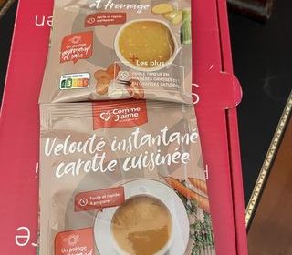 Cède suite arrêt régime, Lot de 34 sachets neufs de veloutés instantanés( 6 veloutés 8 légumes, 13 veloutés tomate cuisinées, et 15 velouté carottes cuisinées. Préparation rapide