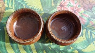 Petits beurriers en grès Lot de 2. Diamètre : 6 cm. Hauteur : 4 cm. Etat impeccable.