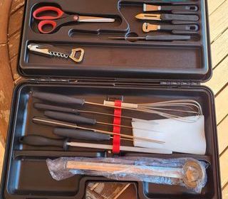 Kit d'ustensiles de cuisine , présenté dans une mallette de rangement . L'ensemble comprend des couteaux, des spatules, un fouet, des pinces, un ouvre-bouteille et une paire de cis
