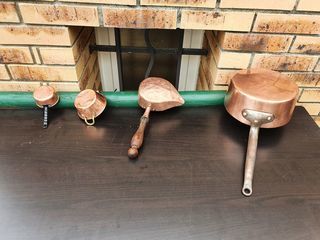 USTENSILES en CUIVRE de CUISINE - PIÈCES ANCIENNES........: CASSEROLE Diamètre: 22 cm - Longueur hors tout 42,5 cm - 23 € SAUCIÈRE 2 bacs 16 cm / 12 cm (pièce très rare).