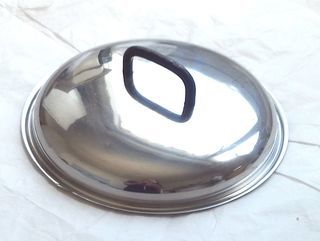 Couvercle en inox bombé Dimensions : 23,5 cm de diamètre extérieur, 21,5 cm de diamètre intérieur, 3 cm de haut environ Bord intérieur rond (voir photo) Poignée en métal Acier