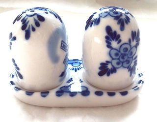 Salière et poivrière hollandaises en porcelaine sur leur plateau, motif de Delft classique, bleu (moulins et fleurs). Hauteur : 7 cm, largeur : 9,5 cm, profondeur : 5 cm Inform