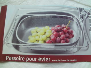 Passoire saine et hygiénique fabriquée en acier inoxydable de haute qualité, sur pieds amovibles, avec poignées rétractables munies d'embouts antidérapants protégeant la surface de