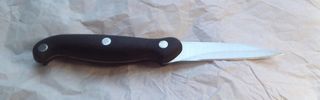 Couteau d'office à rivets (Revere ware) Lame en acier inoxydable prise dans le manche fixé par 3 rivets Usage : nettoyer, trancher, ouvre les châtaignes. Dimension totale : 19