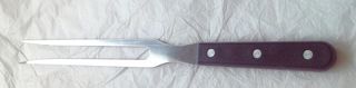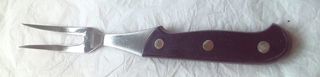 Fourchette à rôti, neuve, de qualité professionnelle. Inox de qualité, (épaisseur 2 mm), manche à 3 rivets. Longueur totale : 33,5 cm Longueur de la fourche : 22,5 cm Valeur :