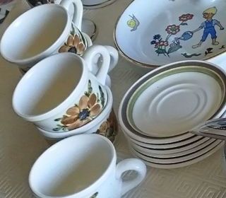 vendons 5 tasses et 6 assiettes à café en gres decor vert