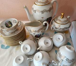Vends un service vaisselle en porcelaine motif personnages excellent état service café 27 pièces soupière service gâteau 10 pièces assiettes plates 22 pièces assiettes creuse