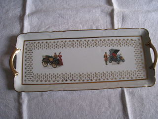 Plat à cake de 1960 en porcelaine de luxe doré à l'or fin. CNP compagnie nationale porcelaine. décor 2 voitures anciennes, avec 2 poignées, en très bon état. Longueur : 36 cm La