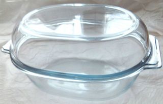 Bol /cocotte en verre borosilicate fabriqué en France, pouvant aller au four Diamètre avec les poignées : 25 cm Diamètre intérieur : 19 cm Hauteur : 8 cm Etat neuf. Informat