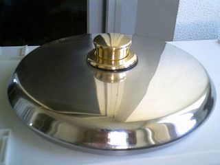 Couvercle en inox de qualité, bouton central en métal doré, diamètre extérieur 26 cm, diamètre intérieur 24 cm, hauteur 3 cm, hauteur du bouton 3 cm Très bon état. Information