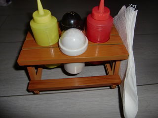 Petite table de pique-nique support assaisonnements composée d salière, poivrière, petit pot pour moutarde et un autre pour sauce tomate. Dimensions 18 x 14 x 10 cm. D'autres détai
