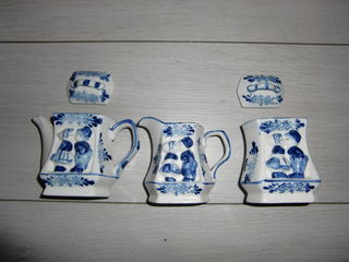 Petit service "Jouons à la dinette!" composé de 3 récipients décorés d'une petite fille et un petit garçon qui se font un bisou. Il y a un pot pour le sucre,un autre pour le lait e