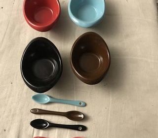 Petits raviers avec leurs cuillers de différentes couleurs, bleu pâle, rouge, marron foncé, noir, avec cuiller coordonnée en porcelaine. Peu passer au four, forme chapeau retour