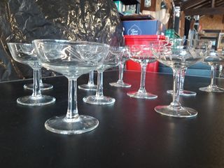 Elégant ensemble dépareillé de 10 coupes à champagne en cristal, dont 5 sont finement gravés avec un décor épis de blé, qui sauront agrémenter, avec leur délicatesse, votre table.