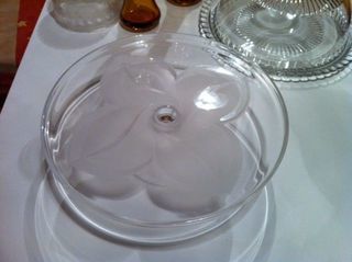 Grand plateau sur pied en verre épais avec une rosace gravée dans le verre, pouvant servir pour fruits, gâteau, tartes etc. Aucun défaut et cette coupe peut être offerte. diam 32cm