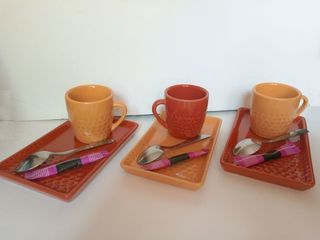 Lot de 3 tasses à café avec sous-tasses en céramique. Très bon état Coloris moutarde et rouille. Sous tasse : L= 155mm, l= 95mm Tasses: H=65 mm Poids = 900gr Livré sans les cu
