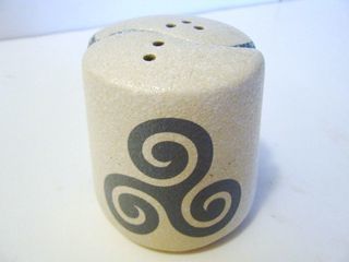 Set salière poivrière en céramique , forme Yin-Yang, coloris gris bleuté motif Triskell. Très bon état, peu servi. H=70mm, diamètre = 65mm poids= 180 gr A enlever sur place ou f
