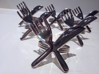 Lot de 6 ronds de serviettes métal inox motif couteau-fourchette. Très bon état Diamètre 38 mm L= 60mm, H= 55mm Poids emballé= 165gr A enlever sur place ou frais de port en sus