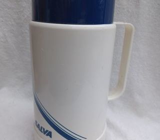 Avec poignée de transport Bouchon à vis et bol Hauteur 29 cm - Diamètre 12,5 cm Plastique alimentaire couleur blanc et bleu Permet de transporter les aliments solides ou liqui
