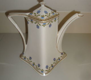 Très rare Service Café Porcelaine Limoges dit aux Barbeaux ( Décor bleuets ) Magnifique, avec sa base carrée pour les pièces de forme. Il est complet Cafetière, sucrier,