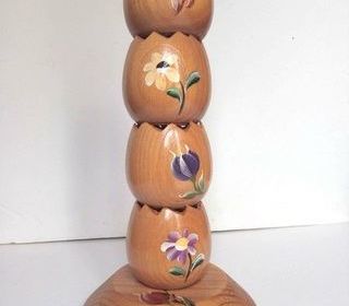 Ensemble de 4 coquetiers en bois tourné avec son support. Motif fleurs peintes à la main Etat neuf jamais servi. Support : H= 25 cm, diam =12 cm Coquetiers : H=5 cm, diam =6 cm