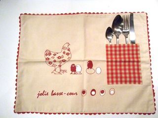 Lot de 2 set de table en tissu à motifs avec poche pour couverts ou serviettes. Neufs Matière : 100% coton Coloris : écru et rouge Dimensions : 45 x 35 cm Poids du lot : 160 g