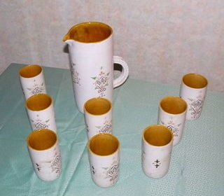 Magnifique service à orangeade en céramique. Origine : Salé près de Rabat au Maroc. Fabriqué par l'atelier OULJA entre 1967 et 1970, toutes les pièces sont signées. A cette époq