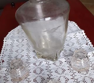 Vends un service à liqueur comprenant une carafe en verre blanc transparent avec petits motifs en surimpression sur le haut et 3 petits verres assortis avec liserés dorés. Hauteur